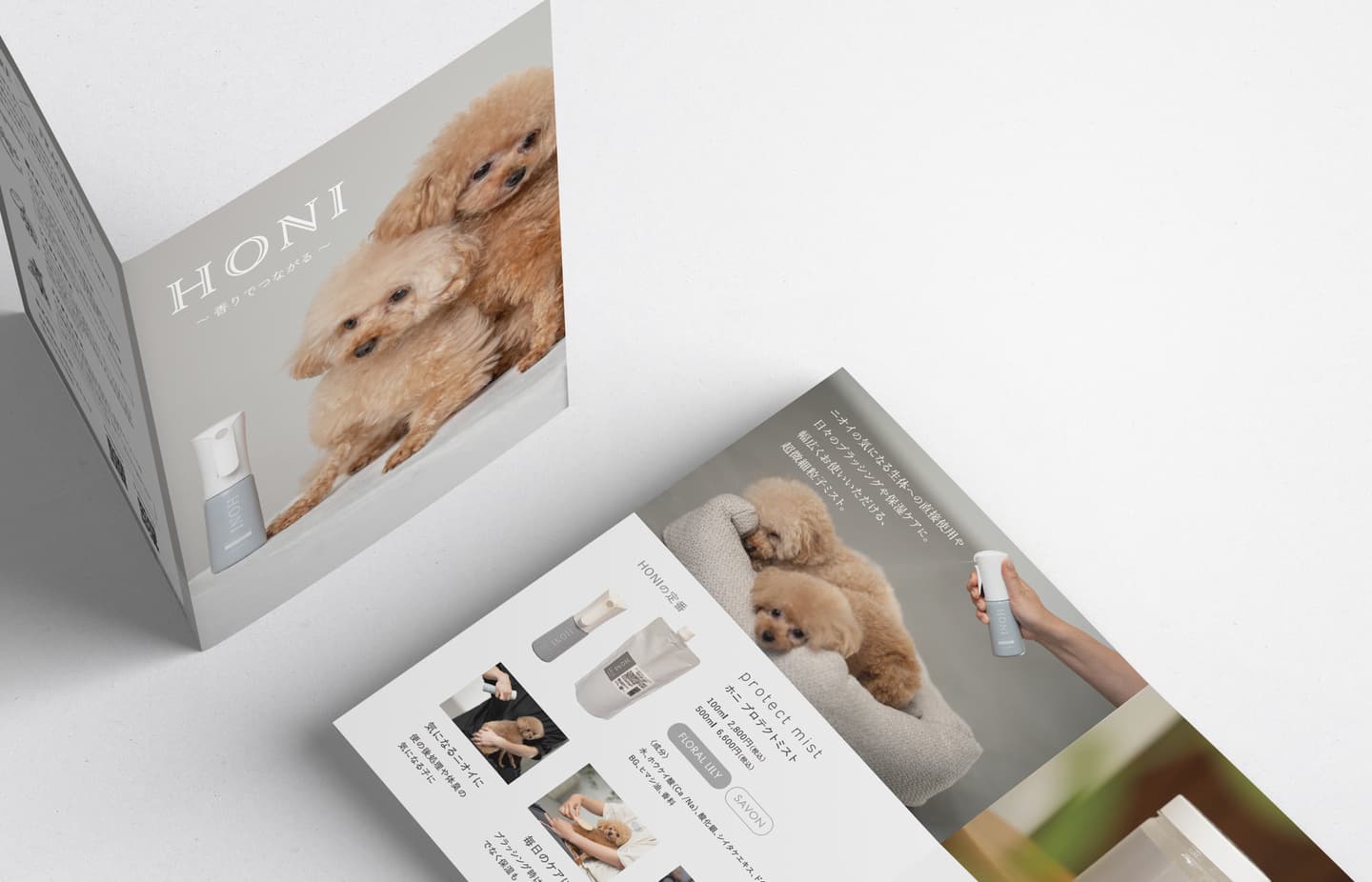 ペットケアブランド HONIさまの商品リーフレットを制作させていただきました。