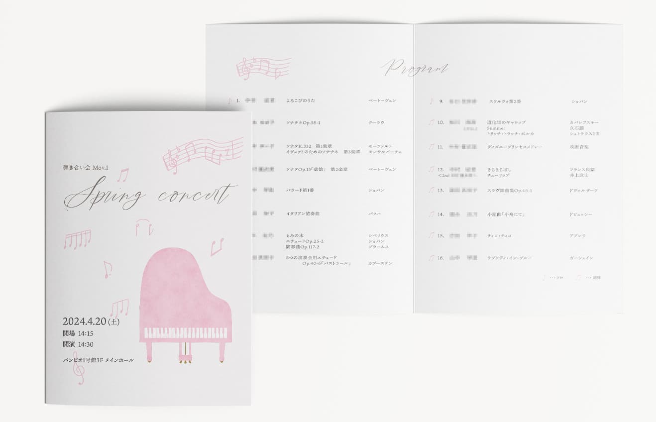 Spring concertということで、淡い桜色のピアノに関するあしらいを全体に加え、春らしさを演出。