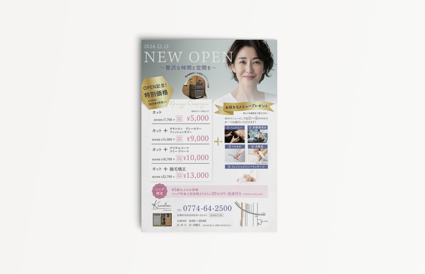 京都の美容室Kanaloaさまのオープニングキャンペーンチラシを制作させていただきました。